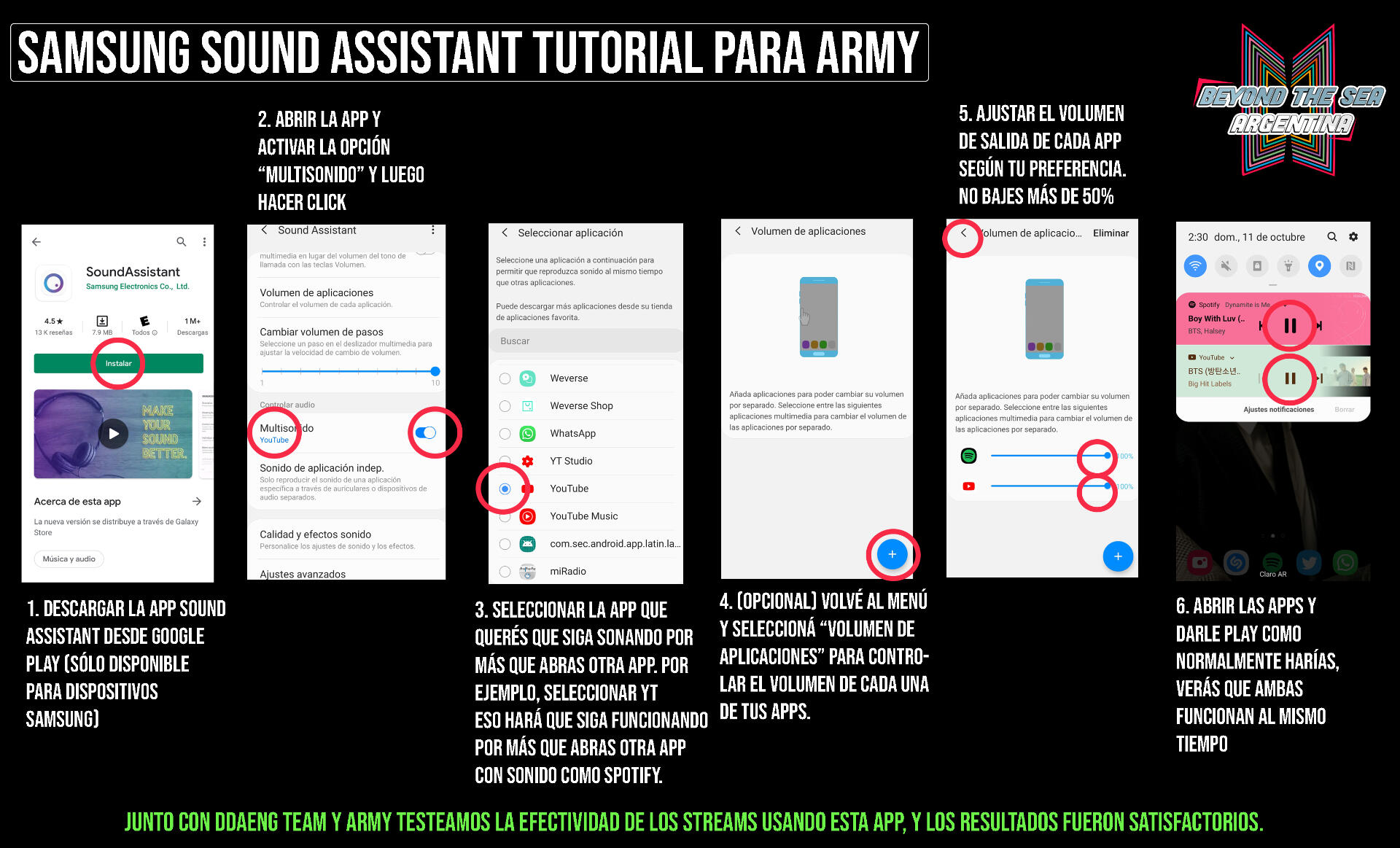 Sound assistant es una aplicación exclusiva para dispositivos Samsung en la que se puede tener más de 1 salida de audio al mismo tiempo. fue testeada para usar Spotify y Youtube al mismo tiempo con resultados favorables.